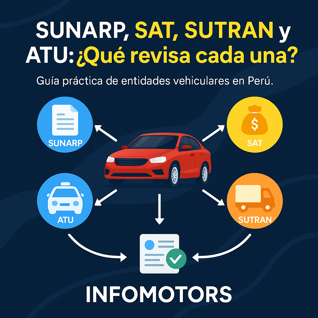 ¿Has intentado revisar la información de un auto y no sabes si hacerlo en SUNARP, SAT, SUTRAN o ATU? 🤔 Tranquilo, no eres el único. Cada entidad maneja un tipo de información distinta sobre los vehículos, y conocer sus funciones te ayudará a hacer una revisión completa antes de comprar. Aquí te explicamos qué revisa cada una y cómo INFOMOTORS las integra todas en un solo informe.