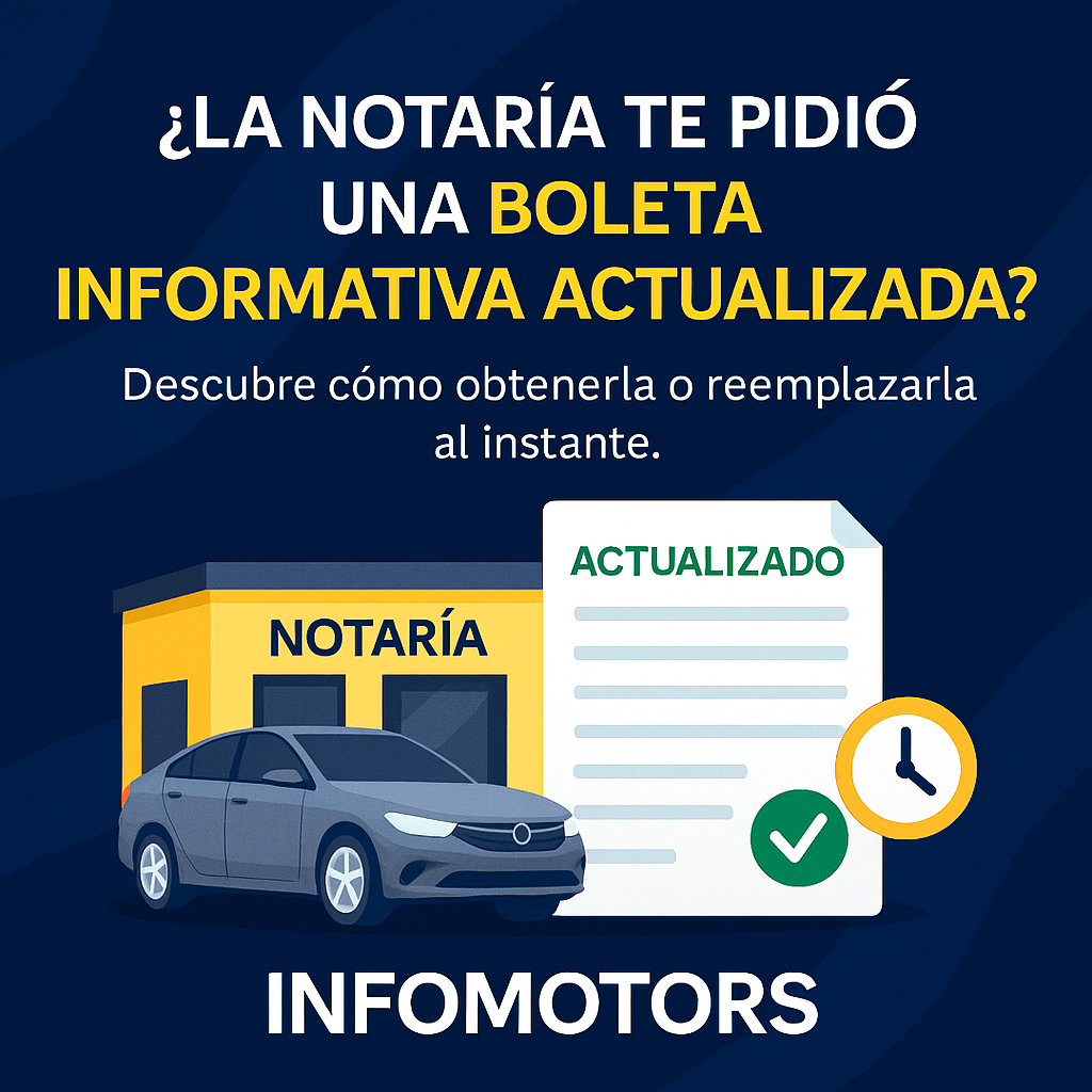 Si la notaría te exige una boleta informativa actualizada y no la tienes, no entres en pánico. Puedes obtenerla directamente en SUNARP o reemplazarla con un informe vehicular completo de INFOMOTORS que incluye datos actualizados, gravámenes y antecedentes. Ahorra tiempo, evita contratiempos y asegura que tu transferencia sea 100 % legal y sin observaciones. ✅