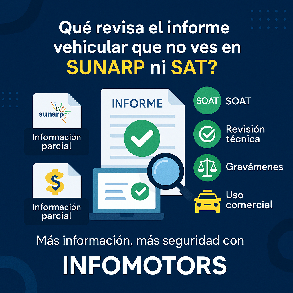 Ni el SAT ni SUNARP te muestran toda la información de un vehículo. Si realmente quieres comprar seguro, el informe vehicular INFOMOTORS es la herramienta más completa del mercado: rápida, confiable y 100 % verificada. Porque la diferencia entre “parecer” y “saber” puede costarte un auto entero. 💼🚘